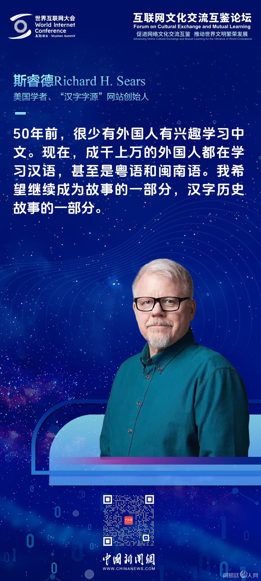 中新网乌镇11月21日电(林卓玮)“事物总是在变化,但文化的传承永远需要我们去努力。”21日,在世界互联网大会乌镇峰会互联网文化交流互鉴论坛上,被誉为“汉字叔叔”的美国汉学家斯睿德(Richard Sears)从创新传承汉字的个人经历出发,讲述了一段跨越75年、连接中美的传奇故事。
