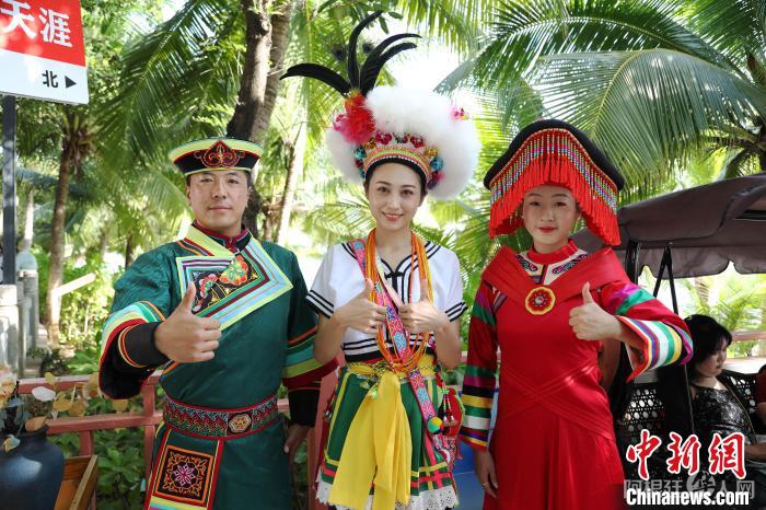 11月26日,海南三亚,参加第十二届全国少数民族传统体育运动会民族大联欢活动的陈海琳(中)与其他嘉宾合影。 中新社记者 李雪峰 摄