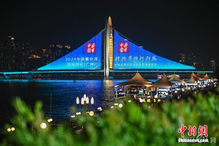12月3日晚,2024年“读懂中国”国际会议(广州)——“广州之夜”文化展演活动在广州塔举行,向与会嘉宾展示广州独特的城市文化魅力。图为猎德大桥为2024年“读懂中国”国际会议(广州)亮灯。