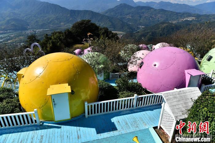 12月3日,在中国少数民族特色村寨——福建省漳州市华安县官畲村内,色彩斑斓的“瓢虫屋”民宿“挂”在高高的山坡上,成为游客来此住宿的首选。中新社记者 张斌 摄