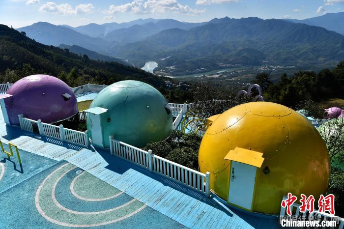 12月3日,在中国少数民族特色村寨——福建省漳州市华安县官畲村内,色彩斑斓的“瓢虫屋”民宿“挂”在高高的山坡上,成为游客来此住宿的首选。中新社记者 张斌 摄