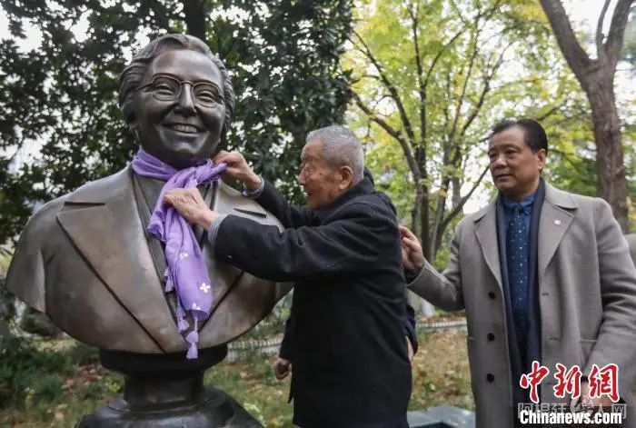 2019年11月30日,第四届“南京安全区”国际和平徒步在南京师范大学随园校区举行。年过九旬的南京大屠杀幸存者葛道荣(左)带着次子葛凤瑾(右),为魏特琳女士雕像系上围巾。中新社记者 泱波 摄