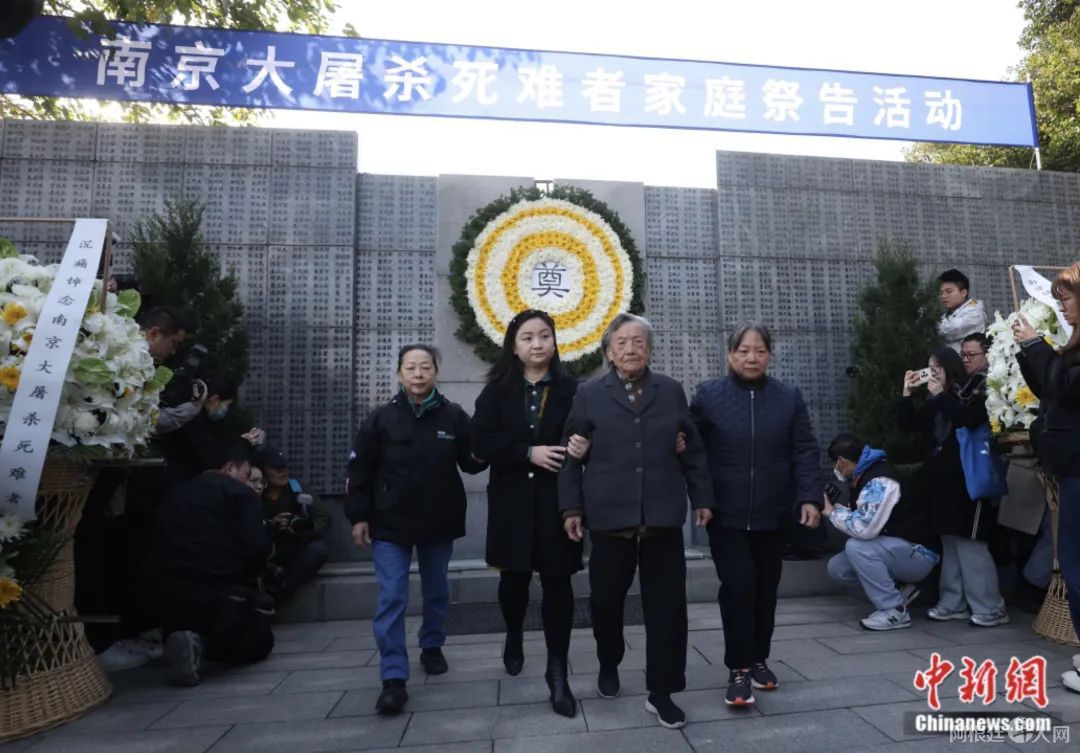 今年12月1日,在侵华日军南京大屠杀遇难同胞纪念馆遇难者名单墙前,南京大屠杀幸存者夏淑琴(左三)在外孙女夏媛(左二)等家属的陪同下,参加南京大屠杀死难者家庭祭告活动。中新社记者 泱波 摄