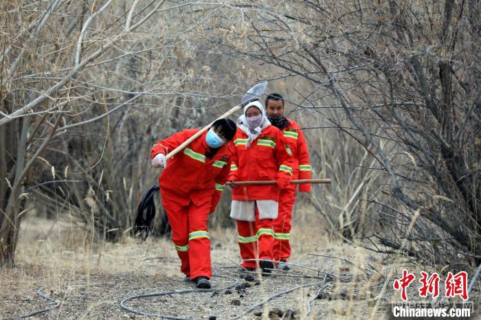 图为12月9日,青海海西格尔木,贾金兰(左一)在千亩林中心管护站巡护。中新社记者 王磊 摄