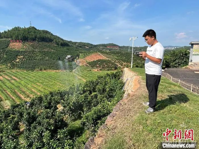 在上饶市广丰区西坛果园,姚献文正操作无人机进行植保作业。朱莹 摄