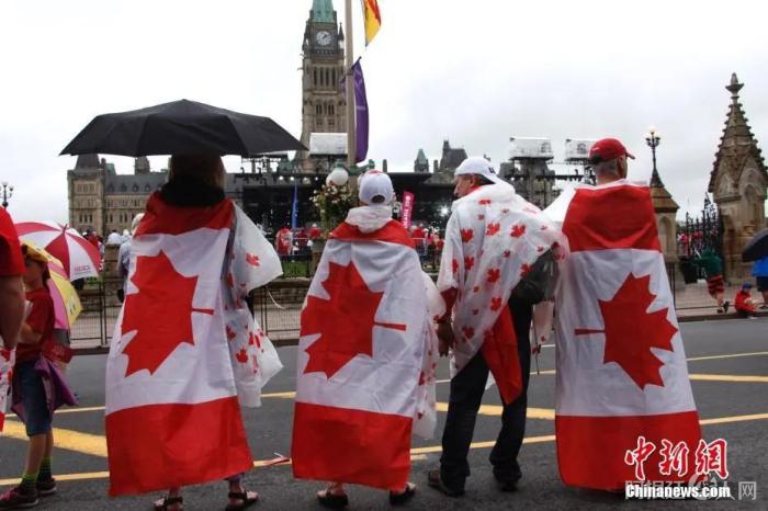 资料图:当地时间2017年7月1日,加拿大迎来联邦成立150周年纪念。加拿大全国各地举行了诸多庆祝活动。图为身披加拿大国旗在民众在渥太华国会山前等待国庆庆典举行。中新社记者 余瑞冬 摄