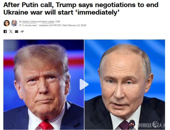 据美国有线电视新闻网(CNN)、俄罗斯媒体报道,当地时间12日上午,美国总统特朗普在与俄罗斯总统普京进行“长时间且富有成效”的电话交谈后表示,结束乌克兰危机的谈判将“立即”启动。