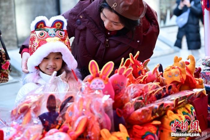 北京街头,家长在北京前门步行街年货市集为小朋友试戴虎头帽。中新社记者 田雨昊 摄