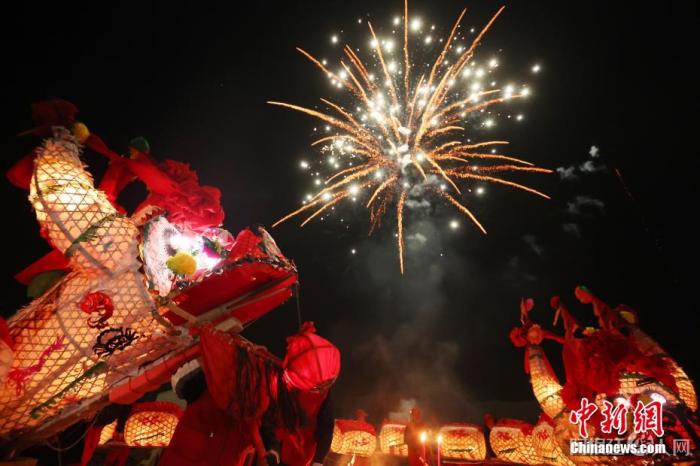2月5日晚,江苏南京,溧水魏家村“魏家双龙”巡游表演,近40条大龙起舞,热闹迎春。中新社记者 泱波 摄