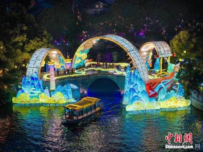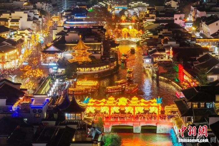 游客在南京夫子庙景区乘坐游船赏灯游览。中新社记者 泱波 摄
