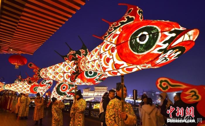 河南洛阳,非遗鱼灯会表演队伍在隋唐洛阳城国家遗址公园明堂景区内巡游