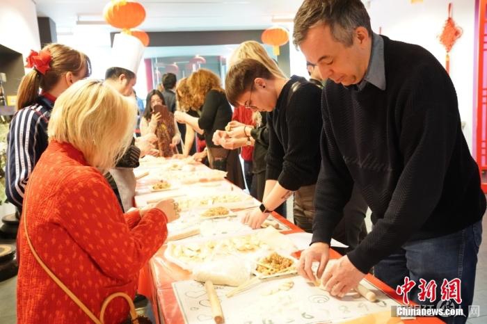 当地时间2月8日,在中国元宵佳节即将来临之际,柏林中国文化中心举办“欢乐春节——走进中心过大年”活动,图为中德朋友体验包饺子。中新社记者 马秀秀 摄