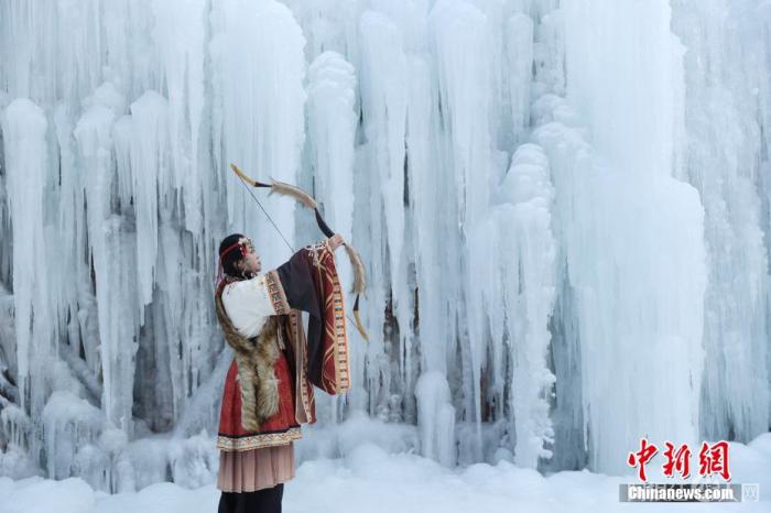2月1日,游客在位于宁夏银川市的贺兰山岩画景区内的冰瀑前拍照留念。中新社记者 于晶 摄