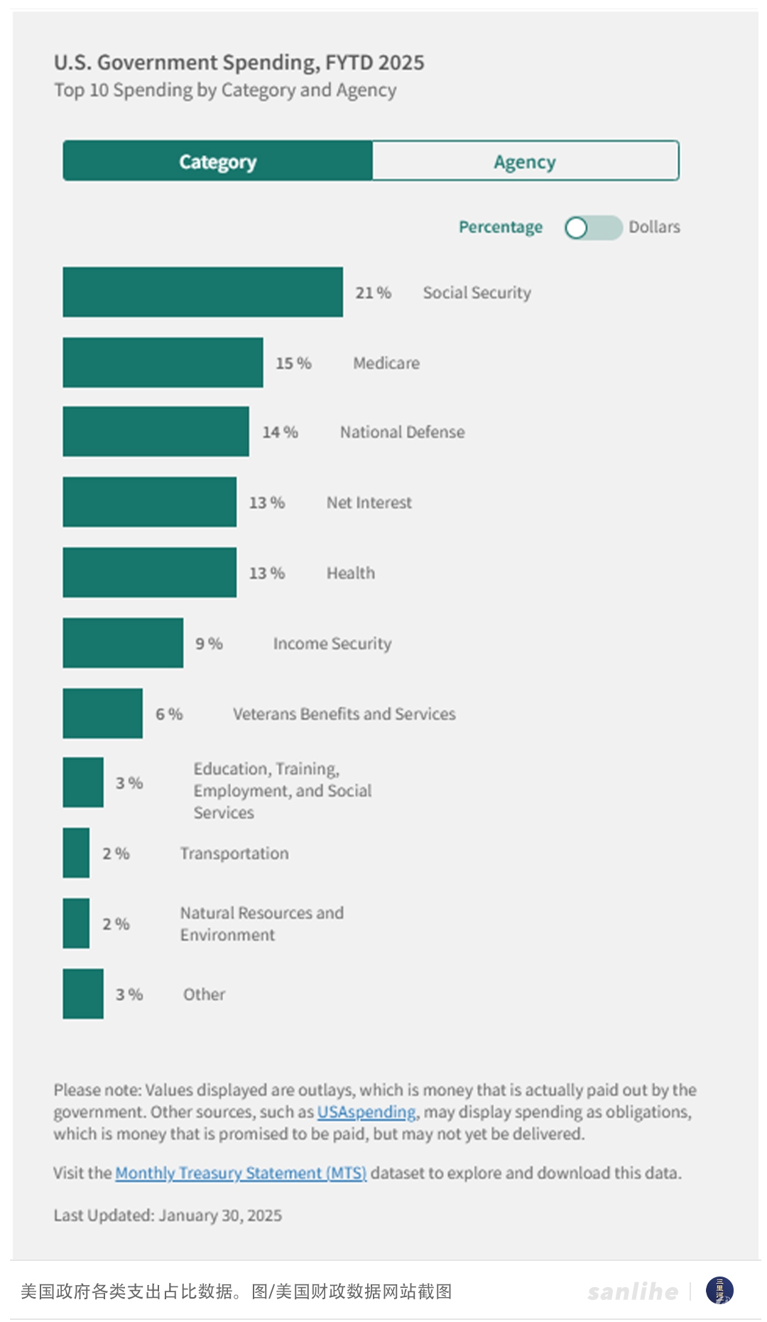 在美国财政部公布的政府各类支出占比中,社会保障、医疗保险、国防等都是“大头”,也都是“难啃的骨头”。