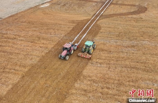 3月12日,位于广西南宁横州市的广西糖业集团良圻制糖有限公司甘蔗种植基地,农户驾驶的耕地机、播种机在田间同时作业。随着2024/2025年榨季甘蔗砍收工作结束、近日气温回升,该种植基地抢抓农时进行甘蔗春耕、春播。(无人机照片)陈冠言 摄