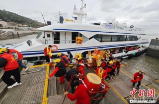 图为各地宫庙代表陆续抵达福建湄洲岛码头。中新社记者 吕明 摄