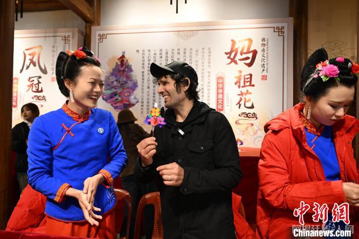 图为3月29日,狄杰在湄洲岛天妃故里遗址公园体验妈祖花制作技艺。吕明 摄