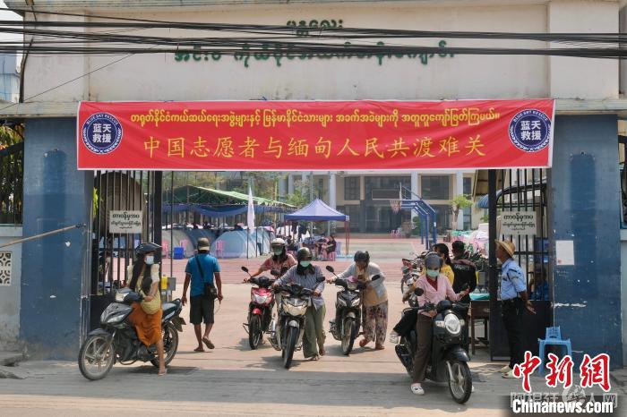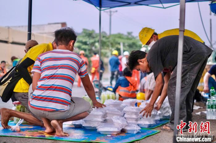 当地时间4月3日傍晚,中国救援队伍在缅甸曼德勒一倒塌建筑持续搜救,当地民众为救援队队员准备盒饭,感谢他们的帮助。 中新社记者 陈永诺 摄