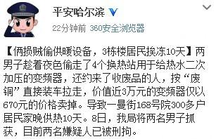哈尔滨两名男子偷供暖设备 3栋楼居民挨冻10天