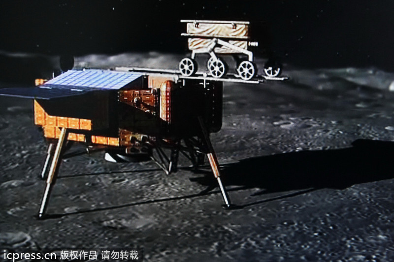 记者在北京航天飞行控制中心飞控大厅屏幕上看到,嫦娥三号着陆器安然立在月面,太阳翼呈展开状态。“玉兔号”巡视器立于着陆器顶部,展开太阳翼,伸出桅杆。