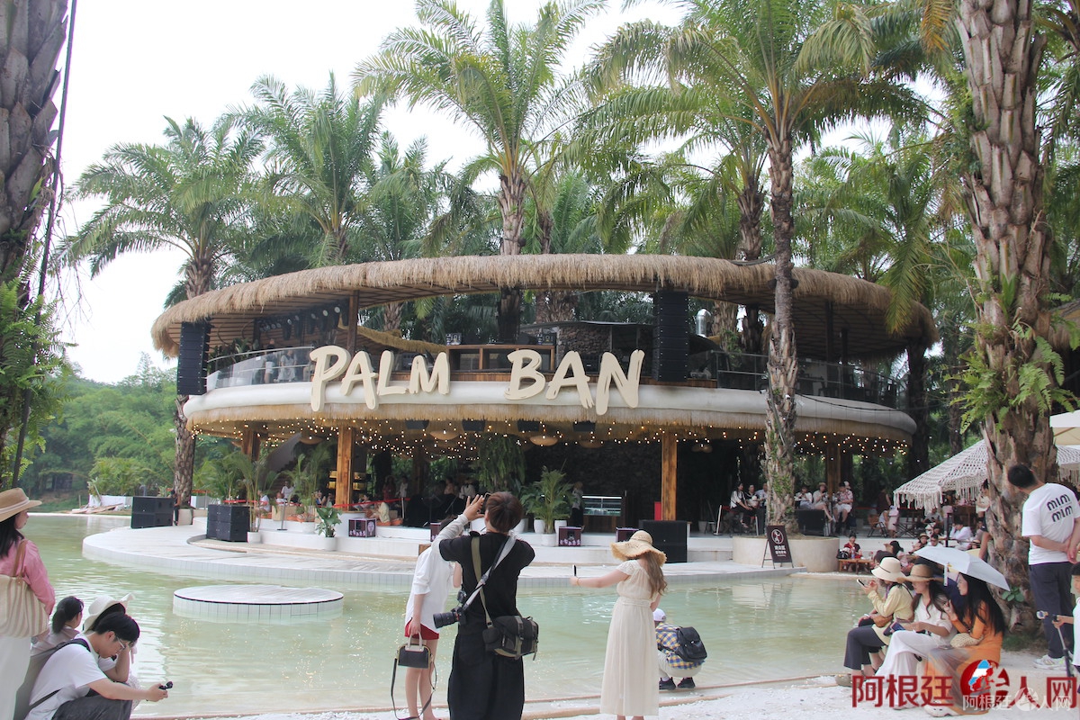 热带花卉园还设计了丰富的互动体验项目:1月的杨桃、2月的羊奶果、3月至4月的桑葚、8月至9月的东试早柚子……游客可在不同季节参与应季水果采摘,品味四季独有的甜蜜。园区内的胶树园时常举行割胶表演,让游客目睹橡胶采集的过程。2025年10月以来,景区全新推出以“蓝湖”为核心的“基米公园”“夜集市”“帕姆班”(棕榈沙滩)等特色项目,传递慢生活理念。位于入口区域的“在树下”集市,依托百年雨树群落,营造松弛、治愈的沉浸式氛围;夜间推出的“山海幻境”夜游项目,融合全息投影、环境音效与雨林实景,赢得了代表们的高度评价。