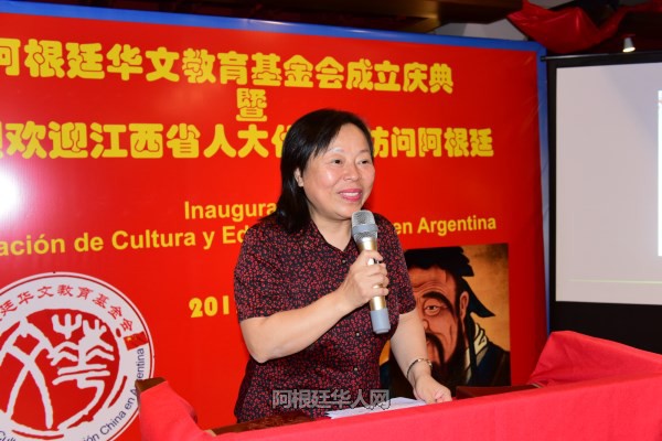 江西省人大友好访问团成员、江西省侨联主席张知明主席致辞,她说:“我受马主任的委托,代表“江西省人大友好访问团”和江西省侨联向阿根廷华文教育基金会的成立表示热烈的祝贺!基金会的成立是阿根廷侨界的一件大事、一件喜事,对于弘扬中华优秀文化,增进中华文化认同感,促进中阿文化交流具有重要意义。
