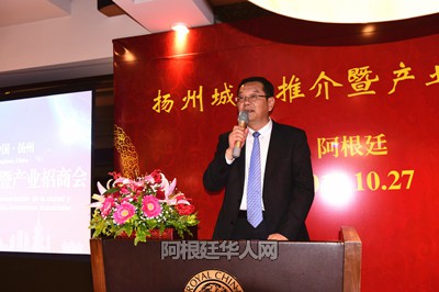 (阿根廷华人网10月28日讯 柳 军/文、图)昨晚,中国·扬州城市推介暨产业招商会在美丽的布宜诺斯艾利斯召开。阿根廷国家议员Ana Maria女士及阿根廷国家政界企业界代表、企业家代表,扬州市委常委、常务副市长陈杨及扬州市政府访阿代表团其他5名成员,中国驻阿根廷使馆陈志军领事,阿根廷中国和平统一促进会会长罗超西,阿根廷福清同乡会会长林文龙,阿根廷阿中投资贸易促进会会长何文强等侨团侨领,华商、华人代表近百人出席了活动。