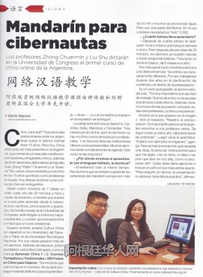 《汉语学习》网络教学合作方,他们选择了阿根廷国会大学。国会大学是开设在阿根廷西部“葡萄酒之乡”的门多萨省,该大学近年来对中国研究作出不少工作:与中国驻阿大使馆合作创办了中国文化之家,为宣传中国历史文化开办了众多活动:收编了中西文《当代》杂志,这是阿根廷第一份宣传推广两国政治经济文化的杂志。