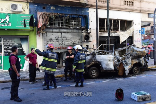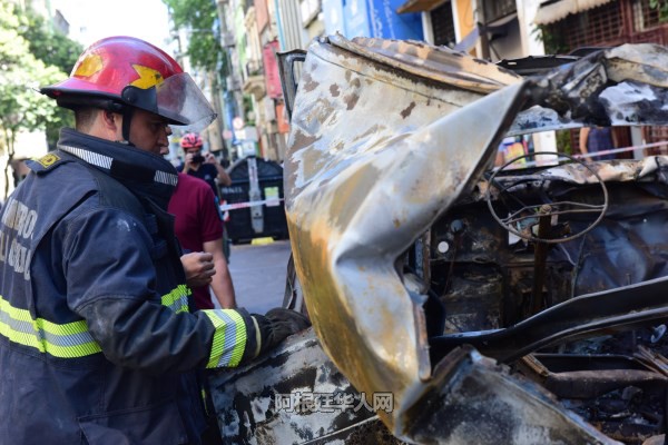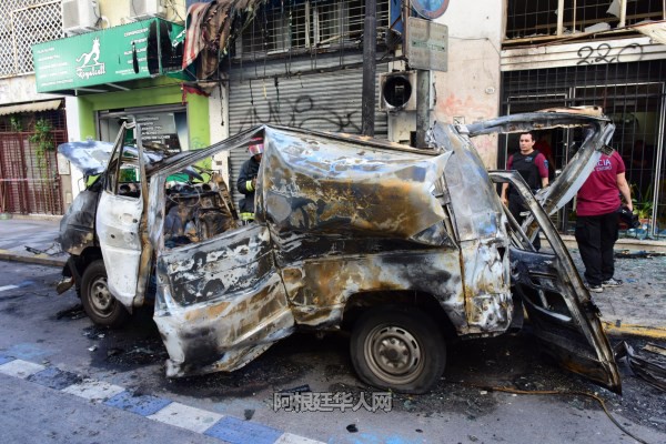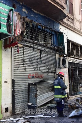 (阿根廷华人网12月14日讯 柳 军/文图)今天凌晨5时许,首都ONCE区Peron2200与Uriburu200交口处一汽车发生爆炸,有四人受伤被送往医院。附近的一店家铁门被炸变形,多家店铺玻璃被震碎,警方在现场调查事故原因。