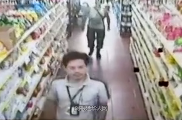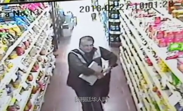 今天上午10时许,几名移民局人员来到布省moron地区一家华人超市检查员工身份。他们进店以后都出示了有关证件,店主由于紧张也没有细看这几位工作人员的名字。稽查人员认真工作时,一名年龄较大头发花白的稽查人员,背着挎包在超市内走来走去,当他来到清洁物品货架前,拿起了一瓶desodorante(除臭剂)放进了挎包里,他是偷窃行为被店内的录像系统拍了下来。