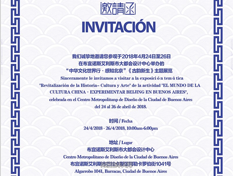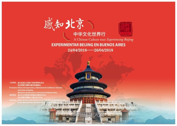 2018年是中阿建交46周年,两国在各领域合作取得了长足进展。为增进北京与友好城市布宜诺斯艾利斯的互动和交流,开启中拉合作新时代,讲好北京故事,传播北京文化和城市形象,由北京市国有文化资产监督管理办公室和布宜诺斯艾利斯市教育和创新局共同主办,北京市文化投资发展集团有限责任公司和布宜诺斯艾利斯市大都市设计中心共同承办的“中华文化世界行?感知北京”活动于2018年4月24日至26日,在阿根廷首都布宜诺斯艾利斯市大都市设计中心举办。活动通过“古韵新生”主题展览、北京文化创意产业推介洽谈会、行业交流等活动,传递中华优秀传统文化力量,展现中华文化在当下的创造性转化,让阿根廷民众感知兼具中华优秀传统文化底蕴和现代国际化特征的都市北京的独特魅力。