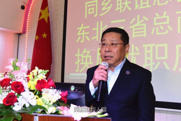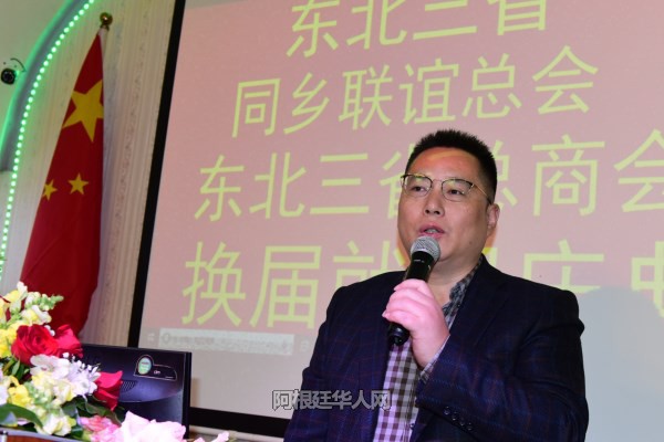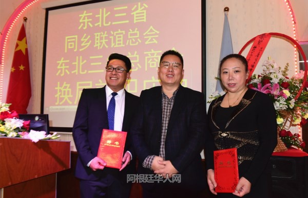 张金良继续表示:今天,我从郭长江会长手中接过重担,深感任重而道远。在此,我向大家承诺,在今后的会务工作中,我一定会竭尽全力,不负众望,带领旅阿东北籍同胞,在使领馆领导的支持和指导下,团结各兄弟侨团,为华侨华人争取更多的合法权益,积极融入当地社会,向当地社会展示华人的良好形象。