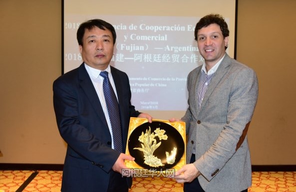 福建省商务厅副厅长刘德培致辞中说:“福建省有良好的投资政策和环境,福建省是中国改革开放最发达地区之一。阿根廷是福建在拉美地区的重要经贸合作伙伴,2017年双边贸易额达6亿美元,其中福建出口4,7亿美元,进口1,3亿美元。至2017年底,阿根廷在福建投资58个企业,外方实际投资1,1亿美元;福建籍华侨华人在阿根廷投资设立超市超过一万家。”