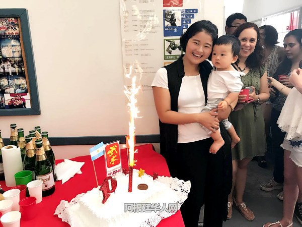 在阿根廷武术俱乐部成立十周年庆典上,陈敏与一岁的儿子在一起。