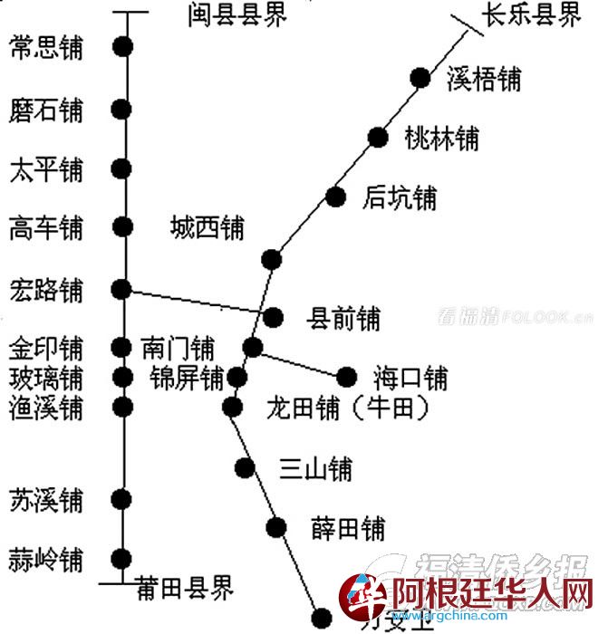 明清时代福清设15个铺,分两条路线:一条是从属省府通向闽南的南驿道,北自闽县的大田驿(今闽侯县祥谦)入县境,经常思铺、磨石铺、太平铺、高车铺、宏路铺、金印铺、玻璃铺、渔溪铺、苏溪铺、蒜岭铺,南出莆田的莆阳驿,为南北之通衢;另一条是把福清东、南沿海与县治、南驿道连接起来,从县前铺向西接宏路铺,向南经南门铺、锦屏铺,折向东至海口铺,向南至三山铺、万安卫(具体见图)Qay阿根廷华人网