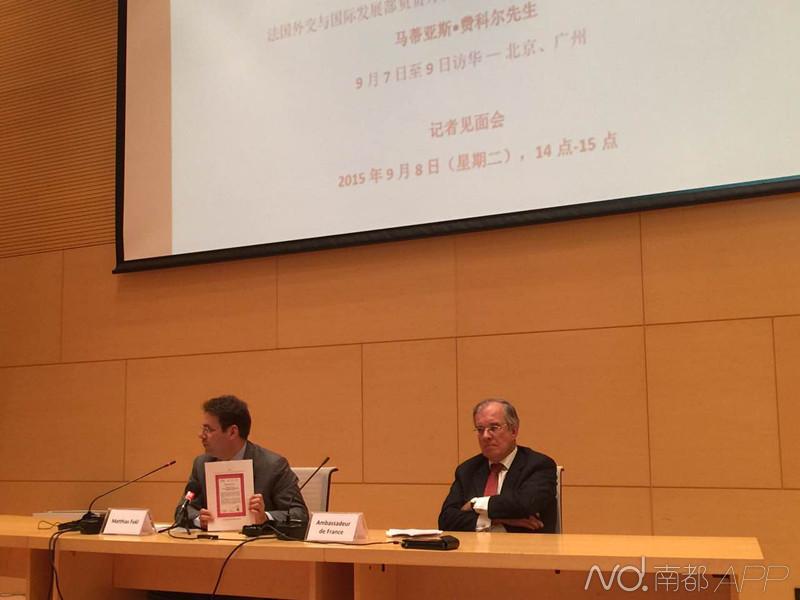 书马蒂亚斯•费科尔(左)展示国际动物卫生组织的评估文件。南都记者吴斌摄南都讯 记者吴斌 发自北京 法国外交与国际发展部负责外贸、旅游与海外法国人事务...