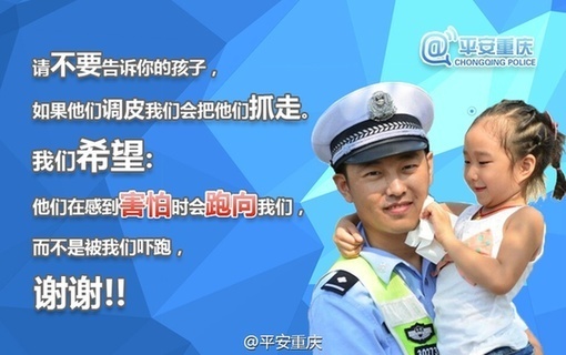 日前,一张“让孩子正确认识警察叔叔”的图片在网络上引起网友、市民的广泛关注。图片内容为:“请不要告诉你的孩子,如果他们调皮,我们会把他们抓走。我们希望他们在感到害怕的时候跑向我们,而不是被我们吓跑,谢谢!”此图引起了不少网友呼吁:应正确教导孩子“认识”警察叔叔,而不应让其成为孩子的“阴影”。