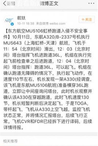 @东方航空官方微博稍晚时候发布消息称,2016年10月11日下午12点03分,在虹桥机场运行过程中,机组按空管指令飞行,发现飞行冲突,及时机动处置,此情况已报民航有关部门调查。