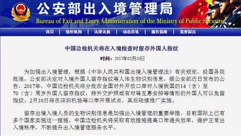 中国边检机关将在入境检查时留存外国人指纹并要求注销其