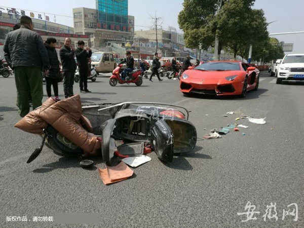 2017年3月29日中午11时30分左右,位于安徽省蚌埠市闹市区主干道上的东海大道上发生一起车祸,一辆价值不菲的兰博基尼跑车与一辆电瓶车发生碰撞。