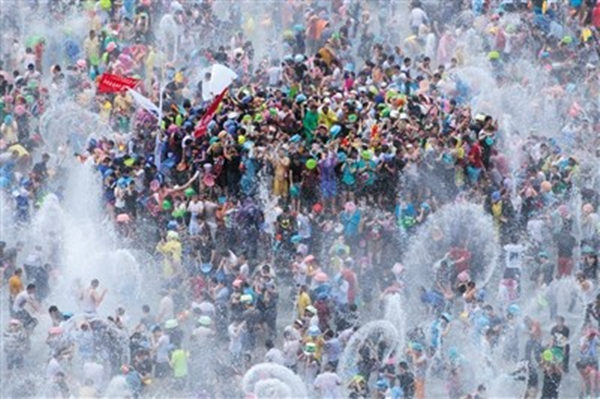 昨日,人们在西双版纳景洪泼水广场参加泼水狂欢。当日,一年一度的万人泼水狂欢在云南西双版纳景洪市举行。新华社发21s阿根廷华人网