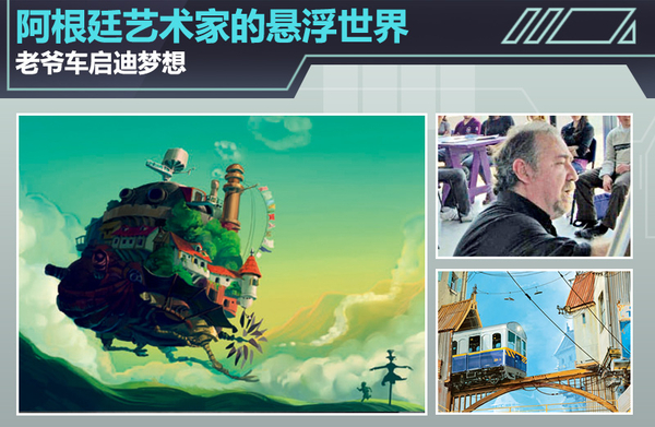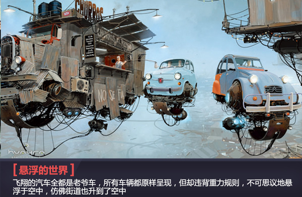 从构思“Universo Chatarra”开始我就很清楚,我想突出的是悬浮汽车的外观,因此我在画车身时非常仔细,力求严格再现最初设计的本意。很多人问我为什么我的作品中没有现代汽车,我总是回答说,今天的汽车都是空气动力的产物,想象它们飞在空中的样子太过容易,但正因为如此使我丧失了创作的动力,我一直喜欢荒诞和不可思议的环境,就像我把老爷车都放到空中,四周都是过去那个年代的场景和人物。