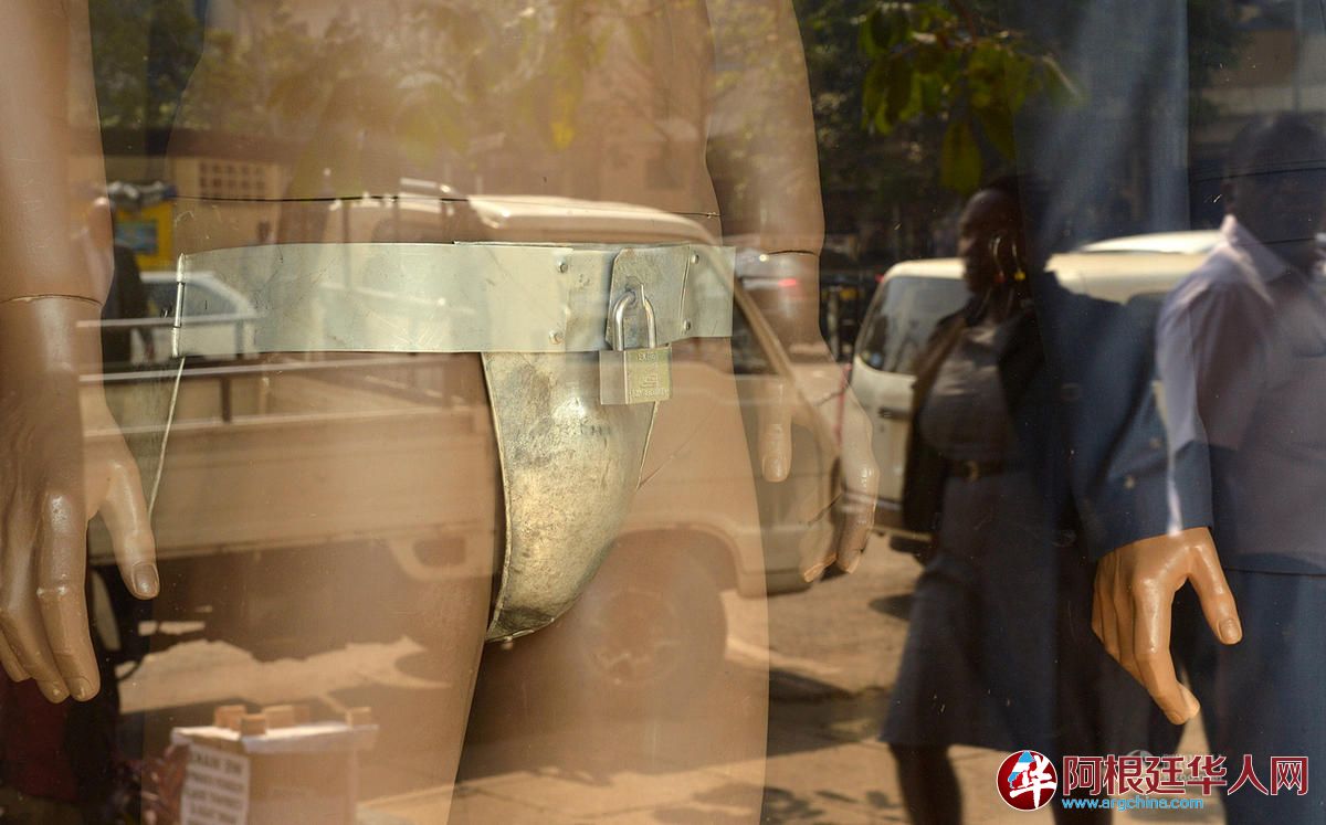 当地时间2015年6月17日,肯尼亚内罗毕,一家内衣店的人体模特穿着一个铁制的贞操带,上面锁着一把铁锁。这个贞操带是为了保护男子免受性骚扰而设计的。
