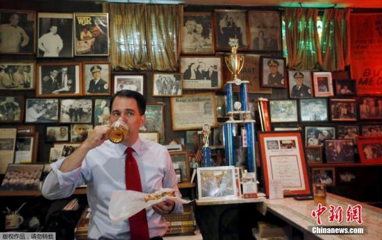 参加美国总统大选的斯考特·沃克在活动间隙,独自坐在吧台喝啤酒吃汉堡,吃喝拉票两不耽误。