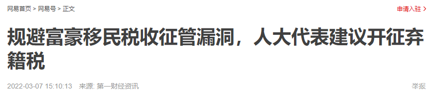 近日,据第一财经采访报道,全国人大代表、上海市人民政府参事陈晶莹表示,鉴于目前我国针对富豪移民的税收征管漏洞,以及部分富豪移民逃税后仍在国内赚钱的现象,建议修订《企业所得税法》和《个人所得税法》,在弃籍者的税收清缴、个税征管和征管流程等方面加以完善。