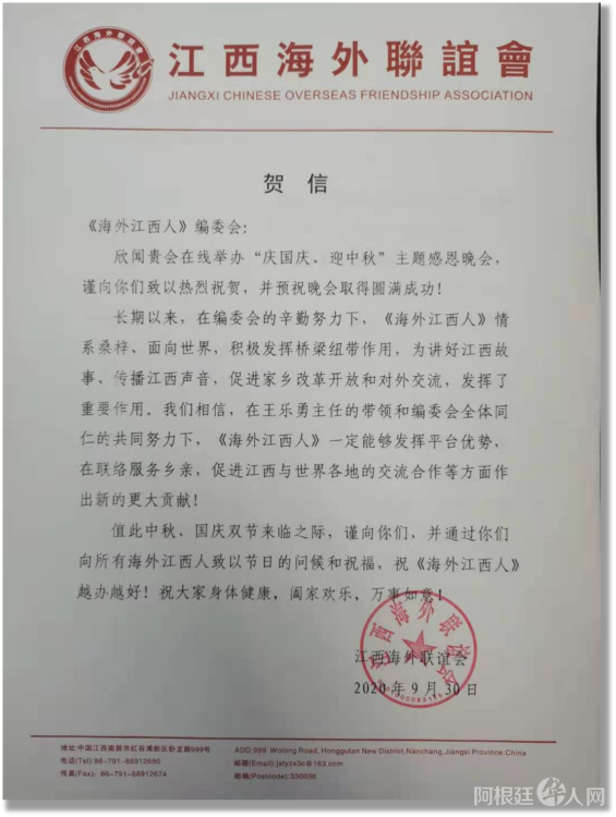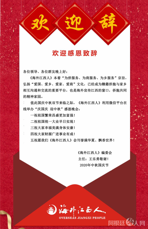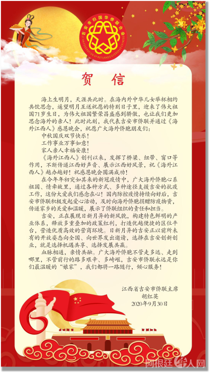 2020年9月30日晚上,正值国庆、中秋前夜,海外江西人抓住双节同日的难得机会,在《海外江西人》联谊群举行国庆中秋感恩受众暨第32期会刊推介晚会,吸引了世界各地200多位群友踴跃参加。