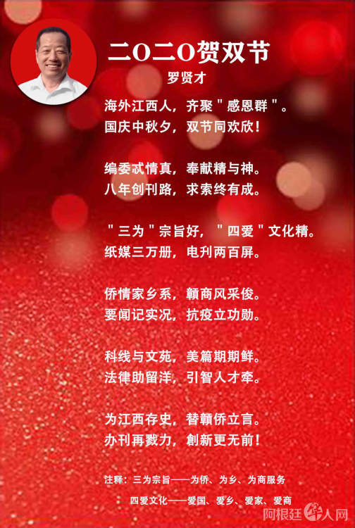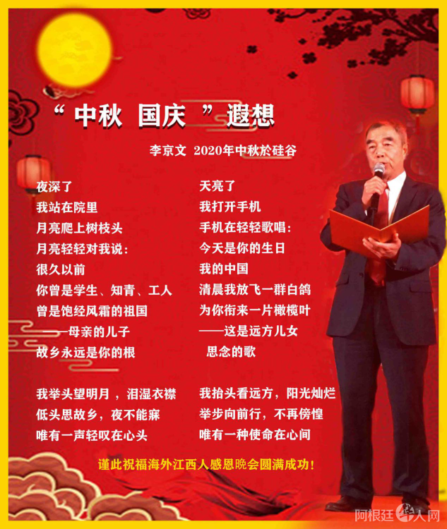 《海外江西人》编委会荣誉主任、会刊创始人李京文撰写并朗诵新诗《中秋-国庆-遐想》,会刊主编罗贤才也送上五言诗《2020贺双节》。四位主持人同时上传各地美好祝福、诗文,晚会气氛再掀高潮。