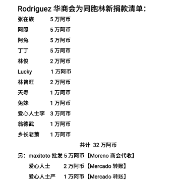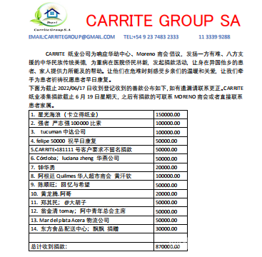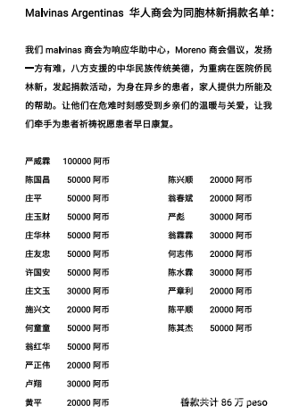 (阿根廷华人网6月20日讯Lisa )昨天下午,由阿根廷华助中心,莫雷诺华人商会,S&T华商联谊会,MALVINAS ARGENTINA华人商会,GENERAL RODRIGUEZ华人商会,SAN MIGUEI华人商会,CARRITE GROUP SA(卡立得纸业有限公司),MAXITOTO SRL,在莫雷诺华人商会会馆内共同演唱《爱的奉献》为侨胞林新祈福,加油!祝福他早日康复。