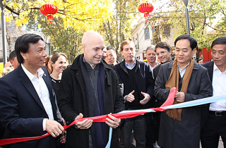 在揭幕仪式上,杨万明大使(右)首先对中国街的崭新面貌表示祝贺,祝愿在此经商生活的大陆和台湾同胞能在这里和谐相处,共同发展。同时杨大使还对于中国街在改造建设过程中布市市政府给予的大力支持表示感谢,并希望能够携手继续发展下去。