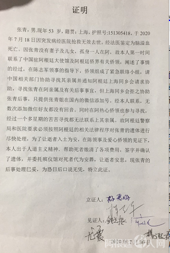 声明 阿根廷平潭同乡会 • 2020-08-31 14:36• 收藏本文 转载本网稿件,原则上需要书面授权,不得篡改稿件主题。本网随时有权要求第三方停止侵权行为。 本网所载内容或图片,若涉及侵权,请联系删除。 31 ___________ 2020/08 声明 证明 张青,男。现年53岁,籍贯:上海,护照号:151305418,于2020年7月18日突发疾病经医院抢救无效去世。经法医鉴定为脑溢血死亡。因张青没有妻子及儿女,孤身... [ 微信长按识别二维码或扫码查看分享内容 ]